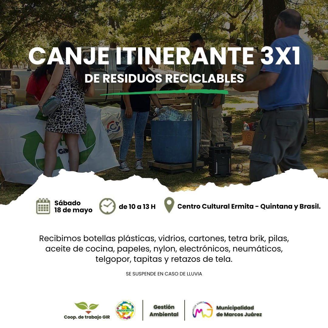 Este sábado de 10 a 13 hs en Centro Cultural Ermita, Quintana y Brasil, se realizará un nuevo canje de residuos reciclables. Se suspende en el caso de lluvia.